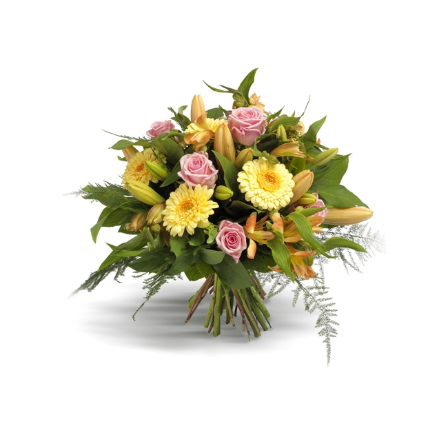 Populär pärla! Favoritbuketten för allt och alla i härligt mjuka och glada färger. Gerbera, liljor, alstromeria och rosor i orange, rosa och gult, mixat med säsongens gröna.